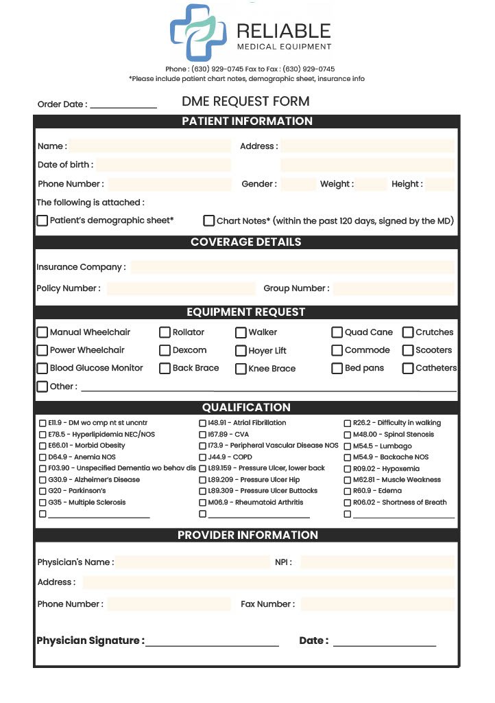 Referral Form Submit a Referral via Fax Download and complete our DME Referral Form.Fax the completed form, along with the patient’s face sheet and recent chart notes, to: (773) 555-0147 DME Request Form